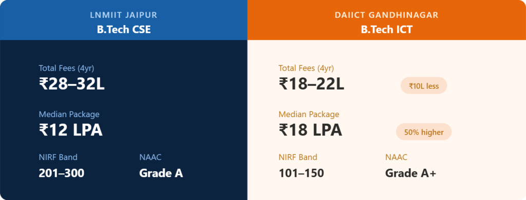 If you’re from Gujarat, DAIICT is significantly more accessible via the state quota. For outstation students, LNMIIT may be more reachable in terms of rank.